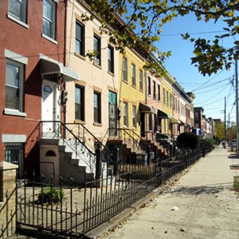 Wyckoff Heights spans across two boroughs with a mix of row houses and masonry buildings along tree-lined residential streets adjacent to commercial districts.