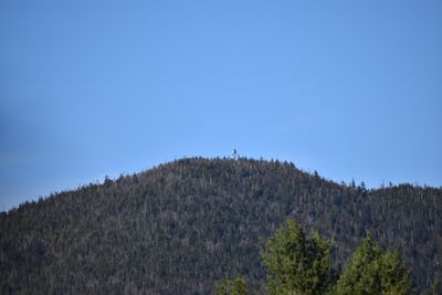 The restored fire tower at the summit provides a 360-degree panorama of the surrounding High Peaks, including Allen Mountain and Mount Marcy.
