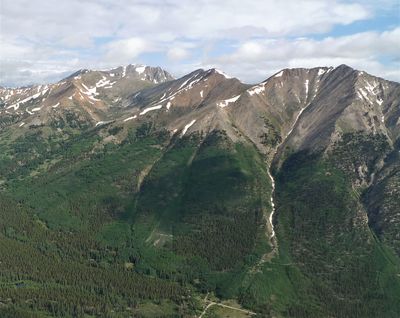 The northeast face of Mount Blaurock features multiple steep ski lines, offering winter sports opportunities that remain relatively unexplored due to the peak's remote location.