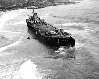 The USS LST-120 tank landing ship measured 328 feet in length with a beam of 50 feet and carried tanks, vehicles, and military supplies.