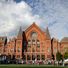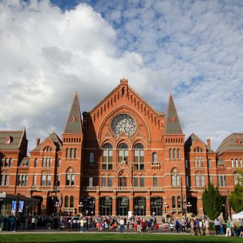 Cincinnati Music Hall is a concert and opera house in Over-the-Rhine, a neighborhood of Cincinnati, known for its Venetian Gothic design with steep gable roofs and elaborate sandstone carvings of musical instruments. The facade displays detailed brickwork and decorative elements that recall Italian palaces.