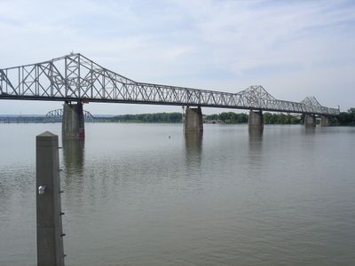 The George Rogers Clark Memorial Bridge is a cantilever bridge that crosses the Ohio River, connecting Louisville, Kentucky to Jeffersonville, Indiana. The steel structure carries four lanes of traffic and dominates the skyline at this crossing point.