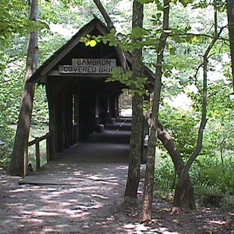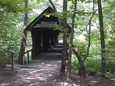 The park, established in 1975, contains several historical structures including the Cambron Covered Bridge, a log cabin, and a vintage train depot.