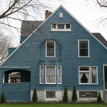 Frederick R. Schock constructed this Shingle Style house in 1888 for his mother Marie Schock, incorporating elements of colonial American design and Arts and Crafts movement.