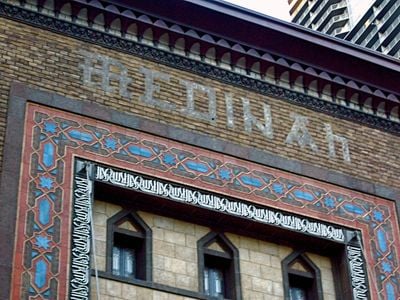 The building incorporates geometric patterns and Islamic architectural elements, including stylized plant motifs created by the Midland Terra Cotta Company.