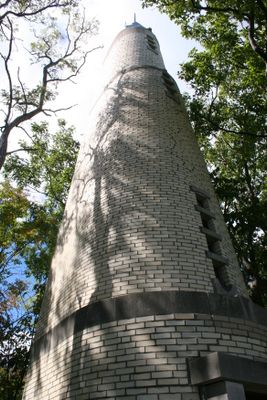 The North Shore Sanitary District Tower features geometric patterns, stone door trim, and windowsills that reach a height of 50 feet in Rosewood Park.