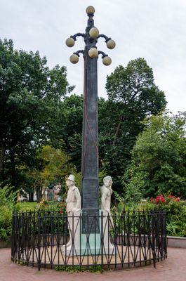 The structure incorporates Newark's city seal and combines both marble and bronze materials in its construction, with the figures mounted on a lamp standard.