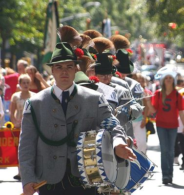 The Von Steuben Day parade fills Fifth Avenue with marching bands, dancers, and participants wearing traditional German clothing and performing cultural presentations.