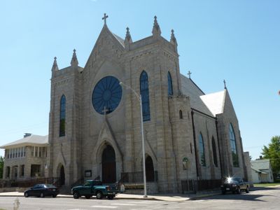 The Late Gothic Revival church building spans 122 feet in length and features circular windows, tracery elements, and Gothic arched entryways made of Carthage limestone.