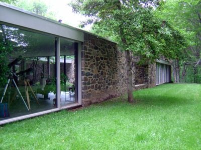 The Hooper House is a Bauhaus-style residence in Baltimore County that spreads across one level and is defined by extensive glass walls. The interior is organized around a central courtyard, from which most rooms open directly outside, while thick stone barriers define separate zones for daily living and entertaining.