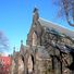 The neo-Gothic structure features a 126-foot tower and houses five large Tiffany stained glass windows within its stone walls and arched entrances.