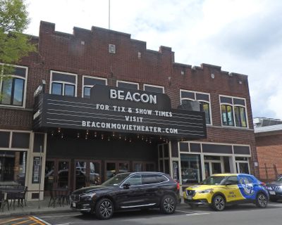 The Beacon Theatre stands on Main Street, featuring an Art Deco entrance with large display windows and a prominent marquee sign above the entrance.
