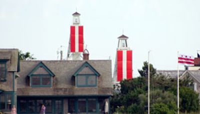 The Nantucket Harbor Range Lights consist of two pyramidal skeleton towers with red and white vertical striped daymarks guiding vessels into the harbor.