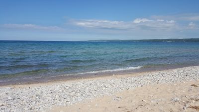 The Old Baldy Trail leads to a large sand dune formation, offering views of Little Traverse Bay and Lake Michigan's clear waters.