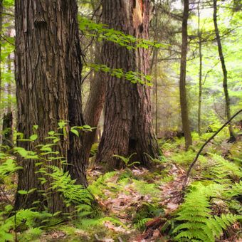 Hearts Content Scenic Area contains a forest of white pine, hemlock, and beech trees reaching heights of 140 feet within the Allegheny National Forest.