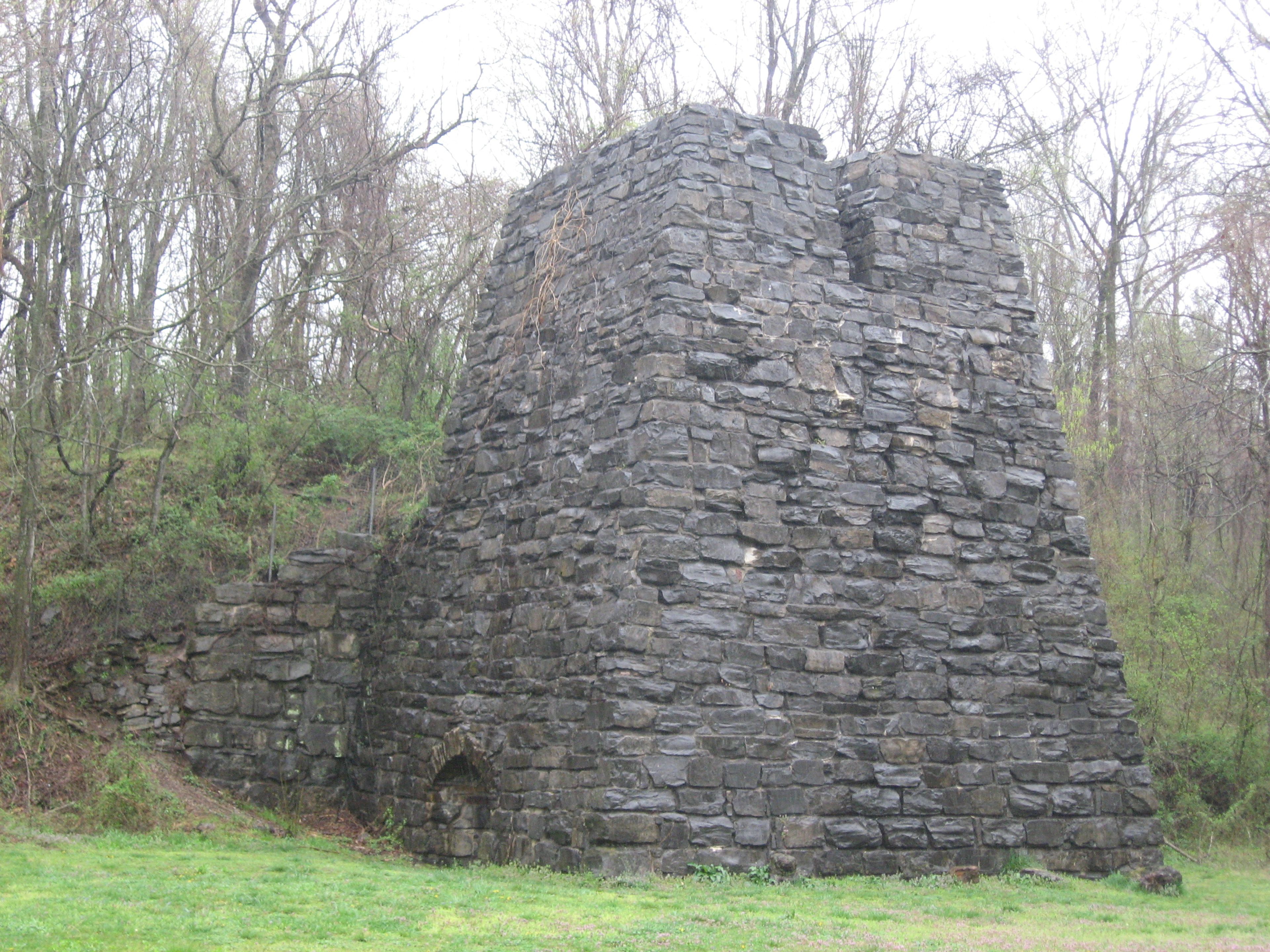 The limestone structure stands 32 feet tall and features a furnace chamber designed to produce iron through the charcoal blast method.
