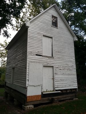 Causey's Mill features original wooden milling machinery, including a hurst frame and millstones, within a two-story white-painted wood frame building overlooking Lake Maury.