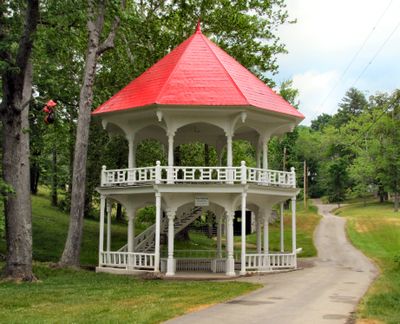The Victorian-style springhouse features an octagonal wooden gazebo with a red sloping roof encompassing a mineral spring water source point.