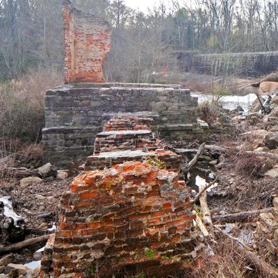 The Pelham Mills complex extends over 6.8 acres along the Enoree River, containing stone foundations, brick pilings, and two steam smokestacks from the original structure.