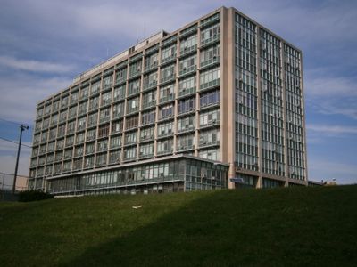 The Hudson County Administration Building features ten floors with a mid-century modern design at 595 Newark Avenue in Jersey City, New Jersey.
