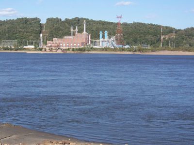The geological formation contains Upper Chesterian limestone and Lower Pennsylvanian sandstone, exposed through Mississippi River erosion patterns.
