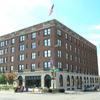 The Eldridge Hotel features 48 suite rooms within a brick building at the intersection of Massachusetts Street and 7th Street in Lawrence, Kansas.