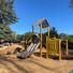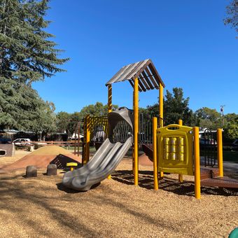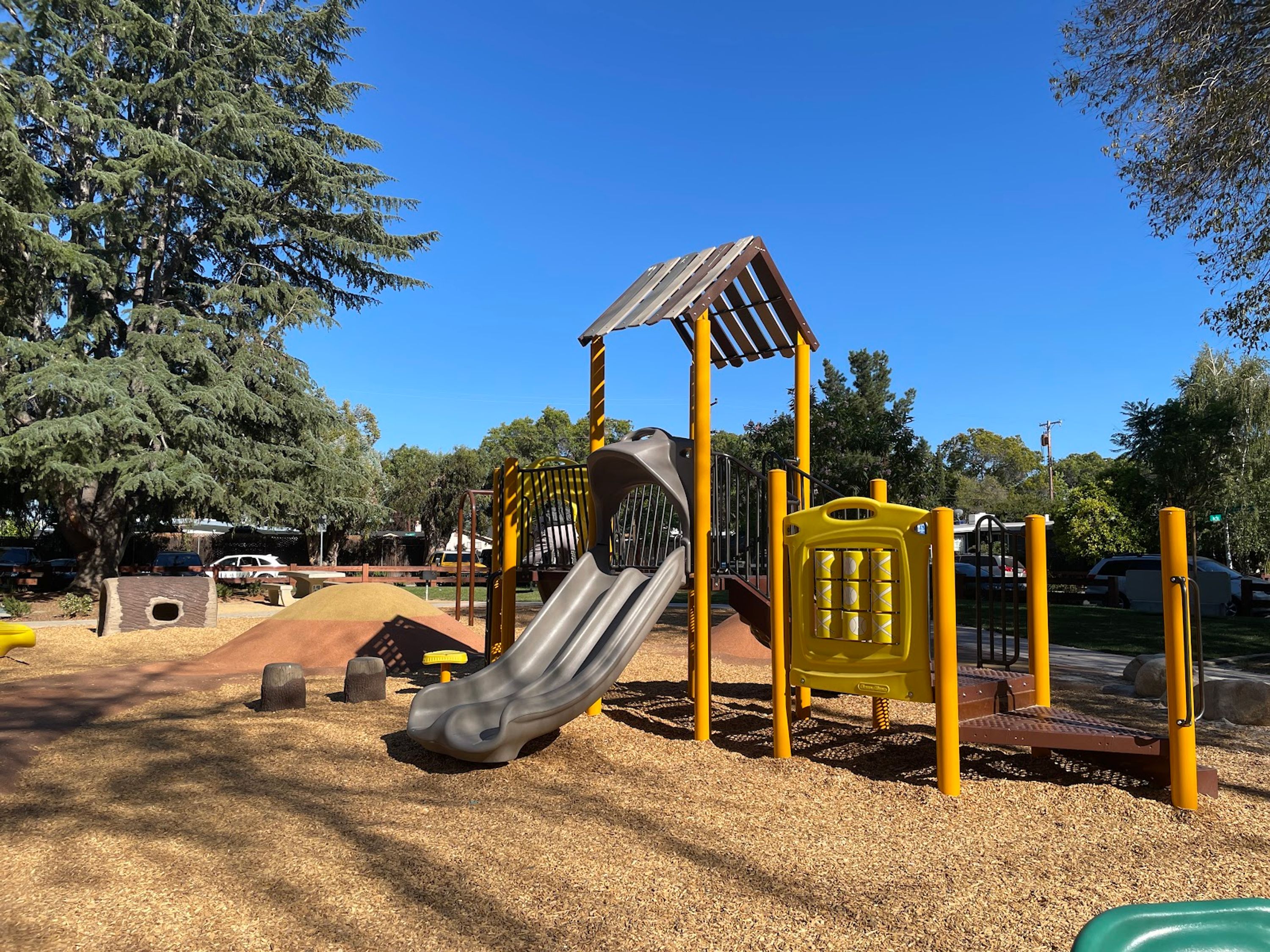 The park incorporates a tree house themed playground with specialized equipment designed for children from early walking age through middle school years.
