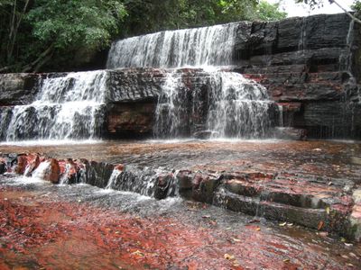 Jasper Creek is a waterfall complex in Canaima National Park with multiple cascades flowing over smooth surfaces of red and black stone. The system extends across several hundred meters and defines much of the landscape in this Gran Sabana region.