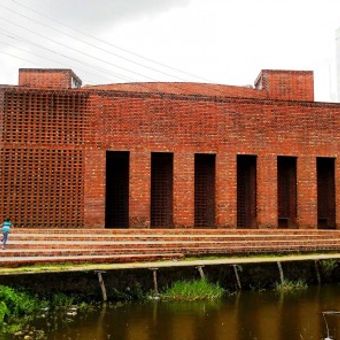 Baitur Rauf is a modern prayer house in Faidabad built with exposed red brick walls and designed to let natural light filter through circular ceiling openings. The interior follows a minimalist approach, creating a focused space for worshippers.