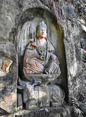 Natural erosion patterns in the cliff face were incorporated by ancient sculptors to enhance the three-dimensional effects of their religious figures.