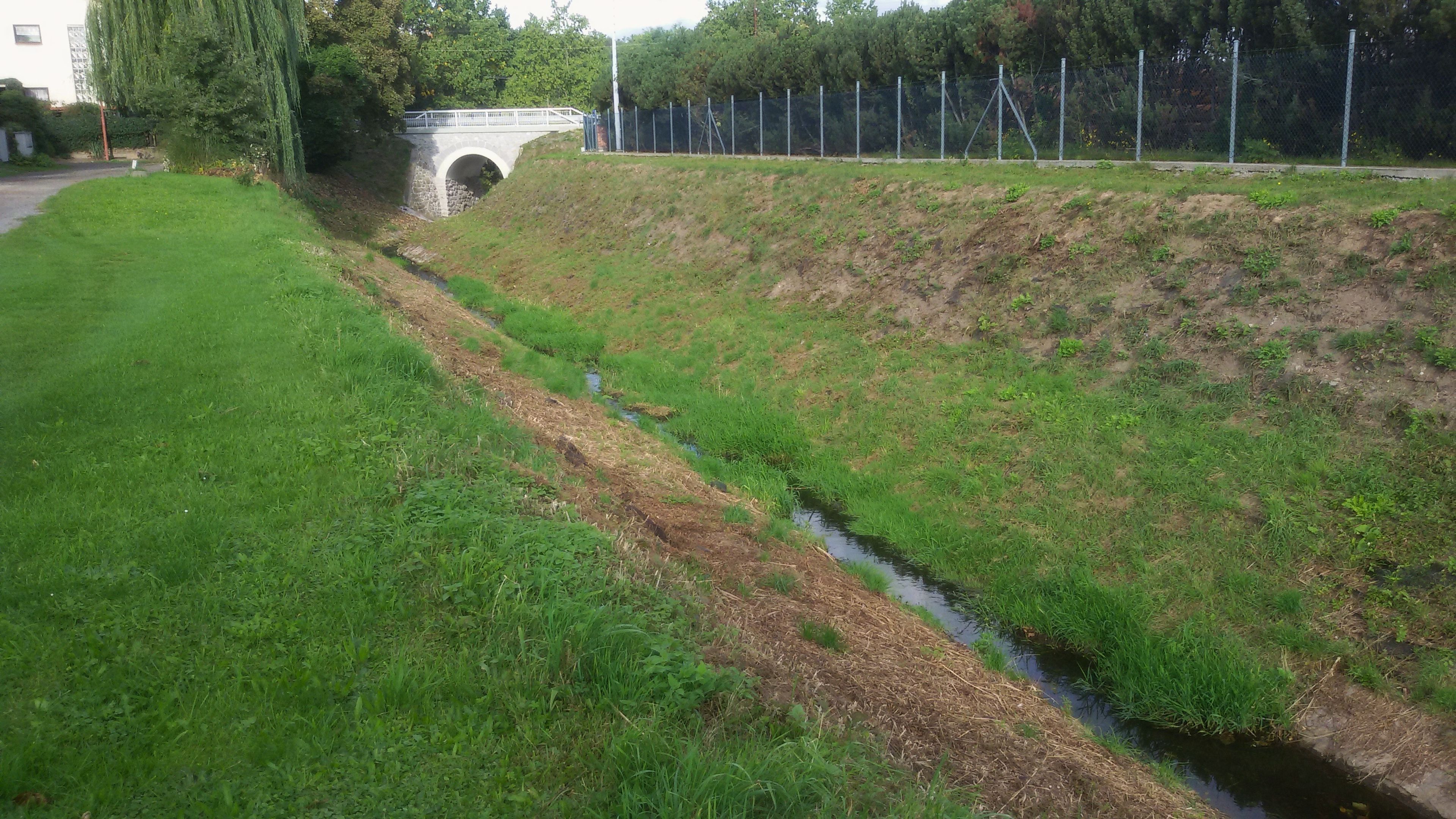 Most Třeboňské ulice přes Rudolfovský potok v Rudolfově, klenutý most silnice II/634 na hranici Rudolfova a Vráta