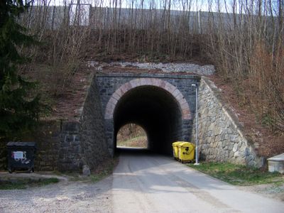 Železniční most ve Čtyřkolech, kamenný klenutý podjezd místní komunikace náspem železniční trati jihozápadně od zastávky Čtyřkoly