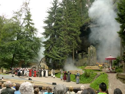 The natural stone formations of the Wehlgrund valley serve as permanent stage decorations, integrating the performances with the surrounding landscape.
