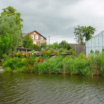 Dove Elbe is a side channel of the Elbe River in Hamburg with controlled water levels managed by locks. The waterway flows through Bergedorf and provides space for leisure activities like rowing and canoeing.