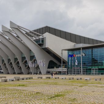 The ÖVB Arena is a multi-purpose hall and velodrome in the Findorff district of Bremen, supported by six reinforced concrete pillars that form a ship bow shape. The building extends 77 meters in length, 40 meters in width, and rises 20 meters high.
