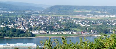 Located 60 meters above sea level, Remagen extends along the western bank of the Rhine River, featuring stone buildings and commercial streets.