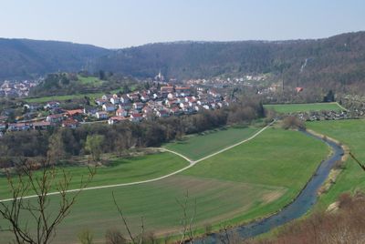 The town stretches along the Swabian Jura mountains, featuring numerous half-timbered buildings and narrow streets surrounding a central marketplace at 516 meters elevation.