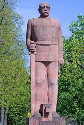 The Bismarck-Denkmal stands north of Boschbrücke, constructed from Rochlitzer porphyry stone, featuring a representation of Germany's first Chancellor Otto von Bismarck.