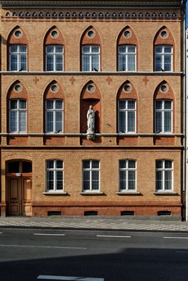 The building incorporates both yellow and red clinker bricks in its facade, with a distinctive Christ sculpture positioned in a niche on the first floor.