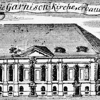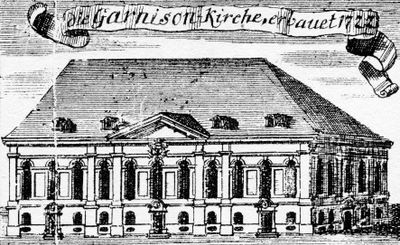 The Garnisonkirche features a prominent tower that marks the urban landscape of Berlin, with neoclassical architectural elements from the early 18th century.