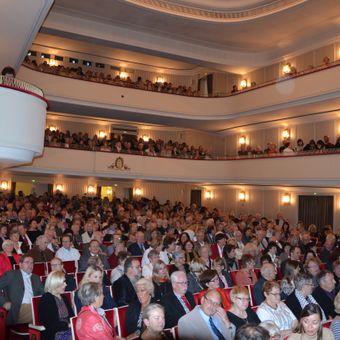 The Stadttheater Lindau features a main auditorium with 688 seats arranged across the ground floor and two balconies, along with an orchestra pit.