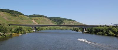 The bridge passes over a wine region where generations of vintners have cultivated Riesling grapes on steep slopes along the Moselle River.