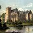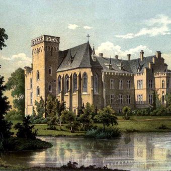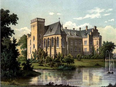 The estate includes a romantic park designed by Thelemann, incorporating ponds, moats, and diverse tree species around the main structure.