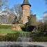 The castle features defensive walls surrounded by water, situated between Düsseldorf-Benrath and Hilden near the old Cologne country road.