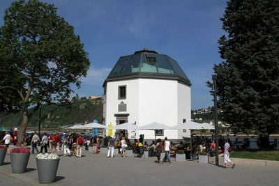 The Pegelhaus stands as an octagonal structure with a profiled base and glass dome situated directly along the Rhine River promenade.
