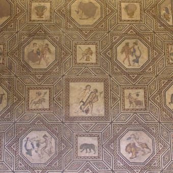 The mosaic illustrates scenes from the life of Dionysus through detailed imagery, reflecting Roman artistic techniques and mythological narratives.