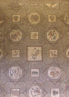 The Dionysus mosaic, measuring 70 square meters, displays intricate patterns and detailed scenes from Roman mythology in black and white tesserae.