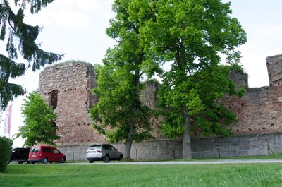The stone walls of Kirchenruine stand among green fields, with its remaining structural elements revealing medieval construction techniques and architectural details.