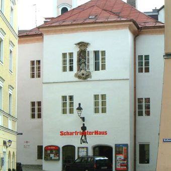 The Scharfrichterhaus occupies a medieval stone building with thick walls, narrow windows, and traditional Bavarian architectural elements near the Danube River.