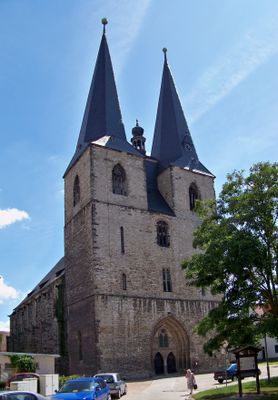 St.-Stephani-Kirche is a Gothic church building in Calbe featuring two 57-meter tall twin towers and represents the largest religious structure in Salzlandkreis district. The building combines a wide central nave with double side aisles in a spacious hall architecture.